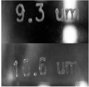 用肉眼觀察9.3μm(上部)波長的激光器打出的標(biāo)識(shí)比10.6 μm(下部)的更明顯。當(dāng)我們把這兩個(gè)標(biāo)識(shí)放在一起比較時(shí),兩者的差別就變得十分明顯了。9.3 μm波長打出的標(biāo)識(shí)像是把表面"煮沸”了,這似乎擴(kuò)大了整個(gè)標(biāo)識(shí),并有了一種白色磨砂的效果,而10.6 μm的只是熔融了表面,顯現(xiàn)出了一種較纖細(xì)的,半透明的效果。根據(jù)實(shí)際應(yīng)用,在9.3μm下能使用快的打標(biāo)速度,因?yàn)闃?biāo)識(shí)也不會(huì)在這種速度下很快消褪。像Kapton and Polyimide(聚酰亞胺)這樣的材料對(duì)9.3μm波長的光有很高的吸收率。又如聚丙烯,聚乙烯,聚苯乙烯等材料對(duì)這兩種波長有相同的吸收率,因此這些材料在相同生產(chǎn)線中打標(biāo)時(shí)標(biāo)識(shí)也不會(huì)有缺失。圖片清晰顯示了不同波長下的熔融的表面邊界情況,9.3μm的標(biāo)識(shí)(上部)具有磨砂效果,而10.6 μm(下部)的則是半透明效果。由此可見我們?yōu)槭裁磿?huì)幫客戶選擇波長9.3μm的CO2激光噴碼機(jī)啦