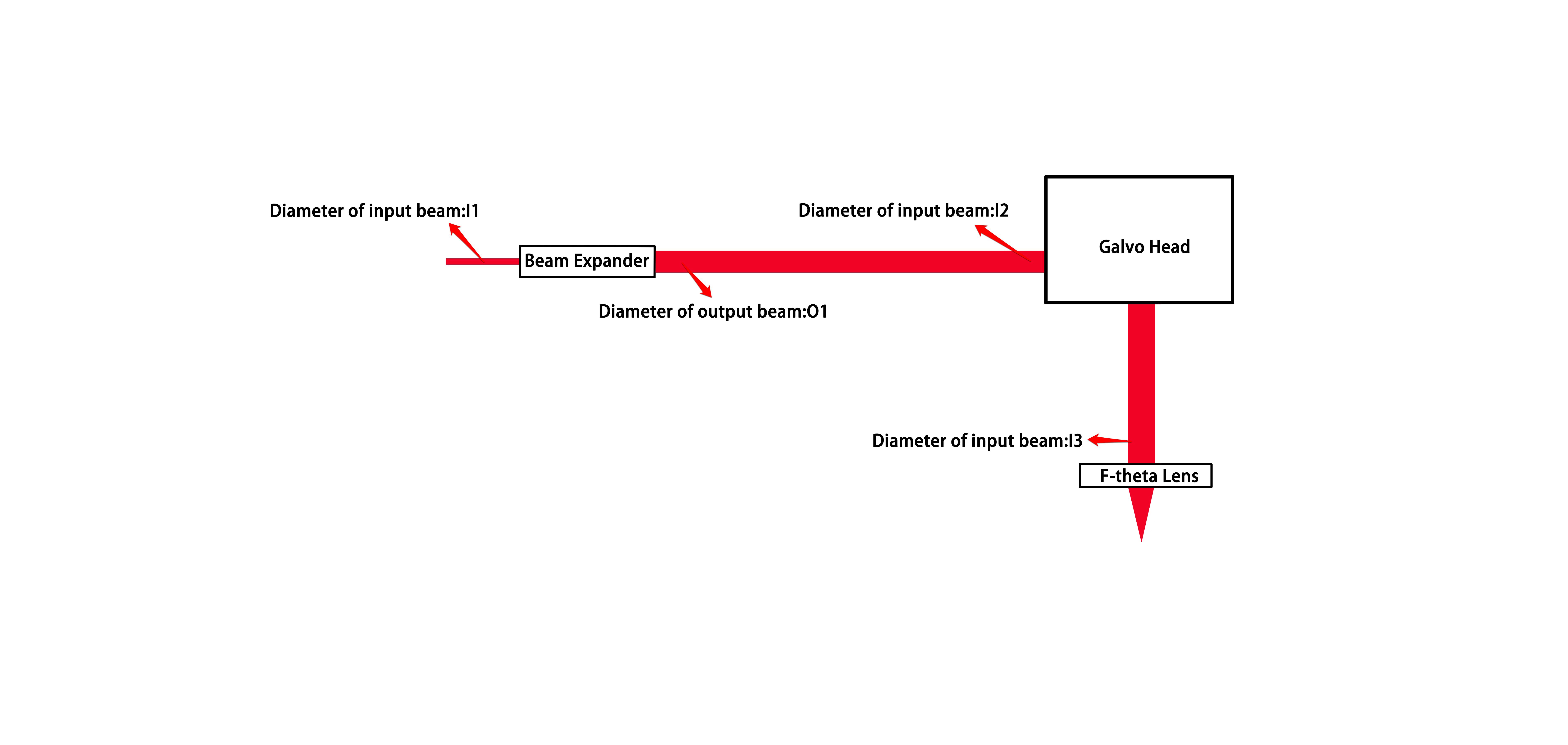 根據(jù)擴(kuò)束鏡的出光直徑O1和震鏡的通光孔徑I2需要一致的情況,我們還要知道激光器的出射光斑從而推斷出需要的擴(kuò)束鏡倍數(shù)。